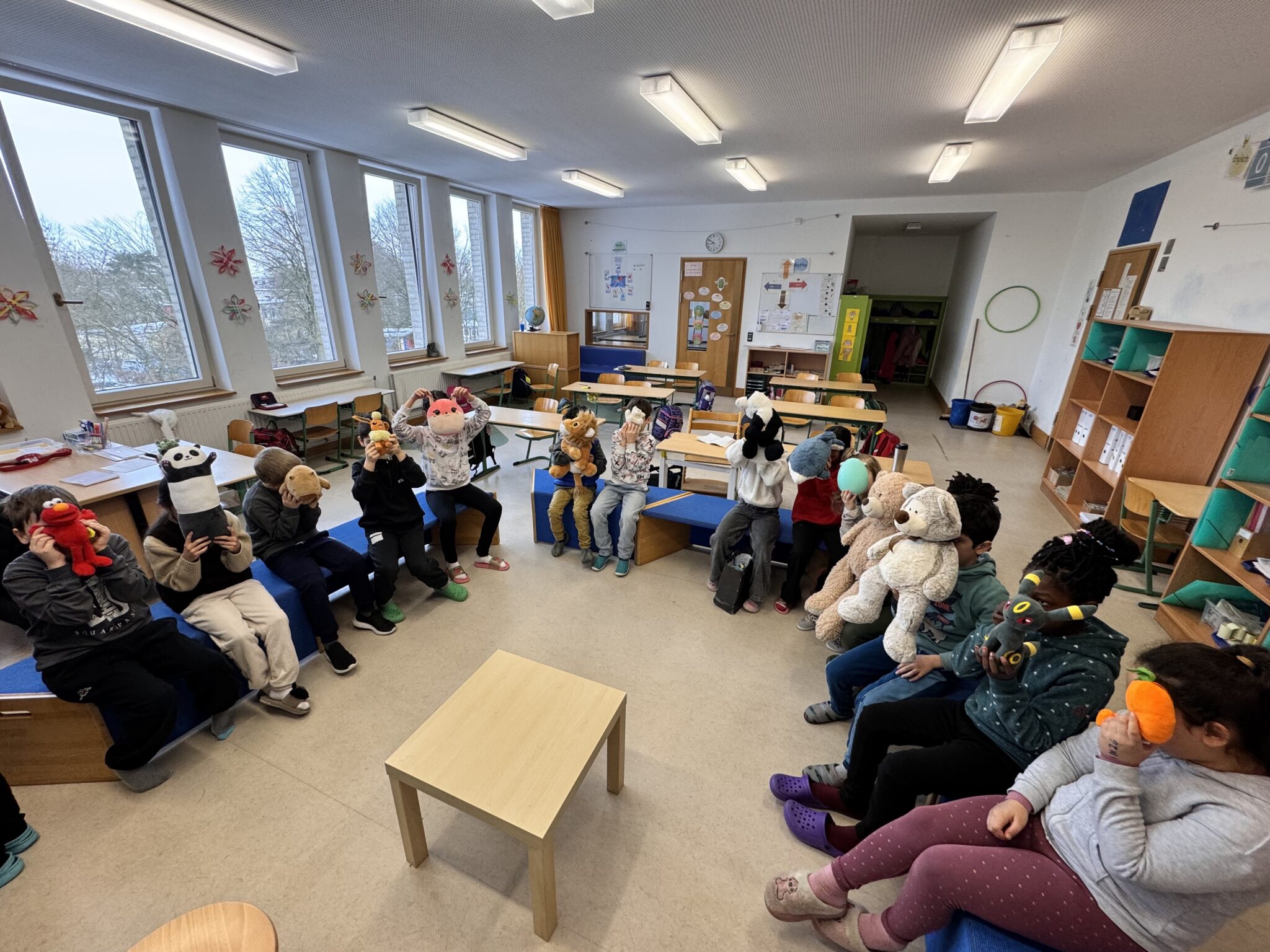Die Kinder durften ihr Lieblingskuscheltier mit zu Schule bringen und statt der SchülerInnen saßen plötzlich viele verschiedene Stofftiere auf den Bänken und Stühlen des Klassenraums.